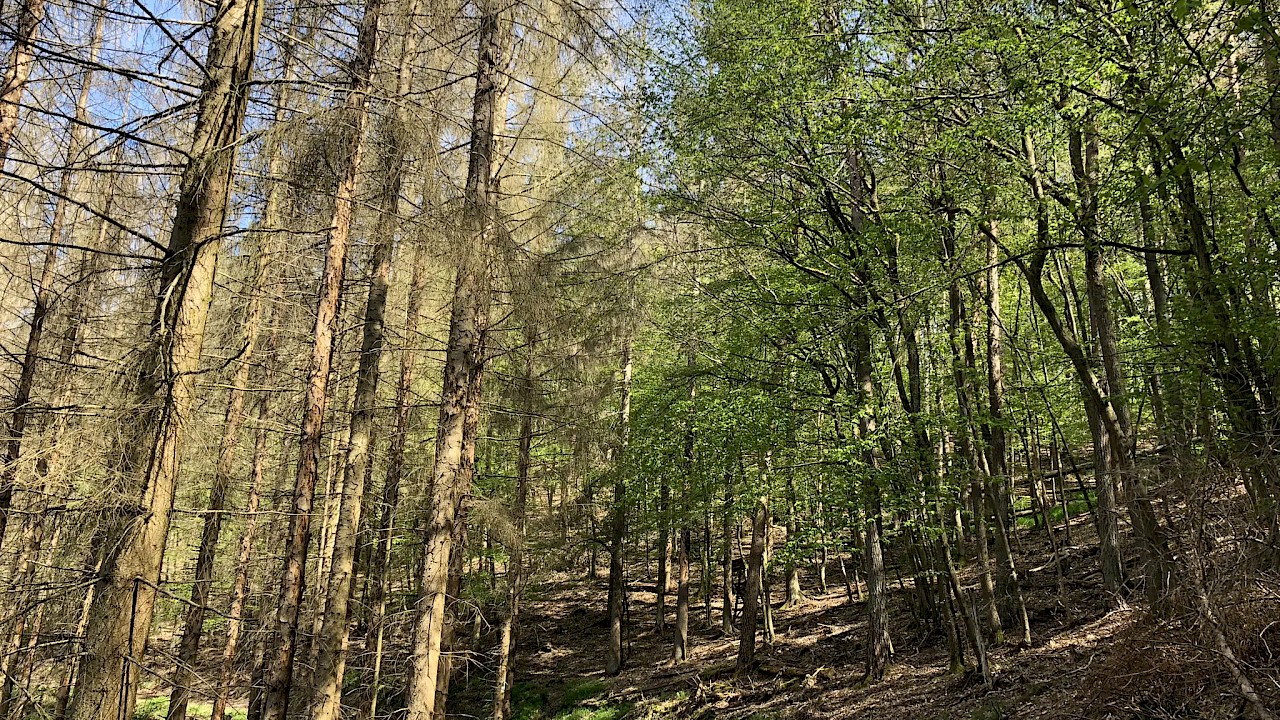 Weiter führt der Weg nach einem scharfen Knick talwärts bis zur kleinen Kapelle „Bildches Eich“. Unter der ICE-Strecke Köln–Frankfurt hindurch und dann zunächst am Waldrand entlang des Holbaches weiter. An einer Kreuzung wird noch ein letzter Anstieg bewältigt. Der pfadige Anstieg wird mit einer tollen Aussicht auf das Umland belohnt. Der Wanderparkplatz an der Studentenmühle, Ausgangspunkt der Wanderung, ist nicht mehr weit und bald erreicht. Der Exkurs auf den Bornkasten ist von besonderem Reiz. Ein steiler Anstieg führt vorbei an einem interessanten geologischen Aufschluss mit fächerartigen Basaltsäulen hinauf zum Gipfel. Als Belohnung gibt‘s eine tolle Rundsicht auf die Wälder von Eisenbachtal, Gelbachtal und Montabaurer Senke.