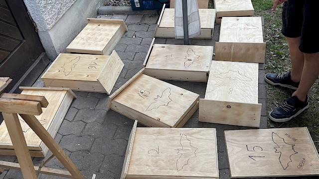 Durch Spende von vorgeschnittenen Bauteilen aus Holz von Mark Gutberlet konnten die Teilnehmenden 21 Kästen für die Fledermäuse zusammenbauen. Nun warten diese noch darauf, gemeinsam aufgehangen zu werden.